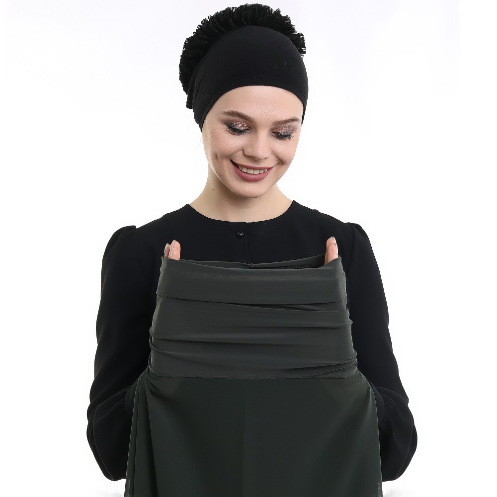Ce Hijab a un bonnet intégré ce qui permet de l'enfiler très rapidement