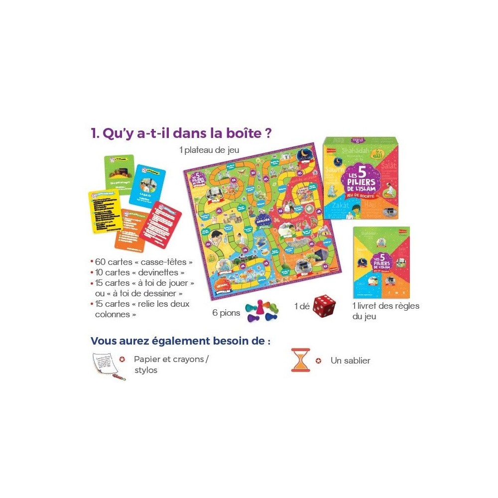 Ces cartes relatent des faits marquants, amusants, instructifs et pleins de sagesse et font participer les joueurs à différentes activités. Ce jeu améliorera et étendra vos connaissances concernant les Cinq Piliers de l’Islam qui sont : la Shahâdah (attestation de foi), la Salât (la prière), le Sawm (le jeûne), la Zakât (l’aumône légale) et le Hajj (le pèlerinage).